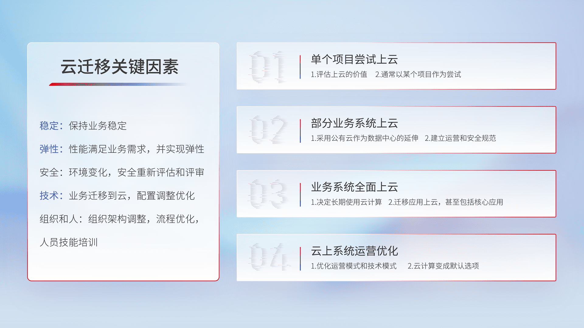 结合实际业务,,,,从规划设计、、、、云平台选型、、、、云原生改造、、、数据迁移、、集成交付,,,,迁移全过程为客户识别最佳上云路径,,,,做好风险识别管理,,,设计网络架构、、身份权限、、、安全审计合规、、操作审计、、日志审计、、、监控告警策略、、、、多站点容灾设计等,,对云上基础设施进行整体规划,,,,提升IT治理水平,,,以满足弹性、、、高可用、、、、高性能的需求。。。